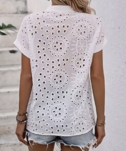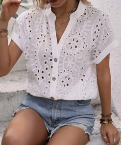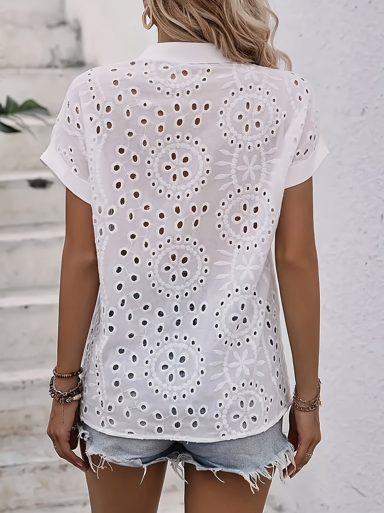 Solid Eyelet Button Front Shirt Casual Short Sleeve Shirt