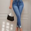 2024 New Fashion Stylish Women’s Skinny Fit Jeans – High-Waist, Frayed Hem, Distressed Washed Denim Pants With Stretch For Comfortable Street Style Fashion – Women Clothing